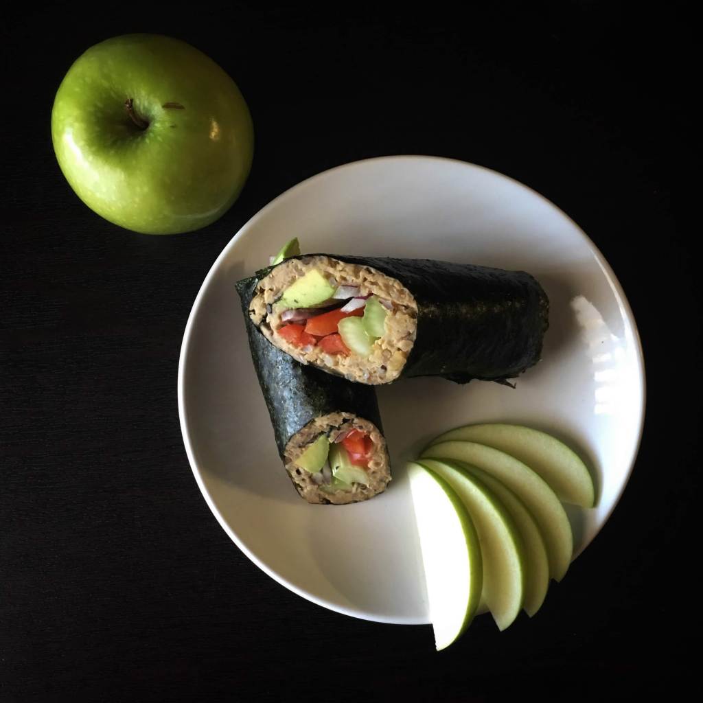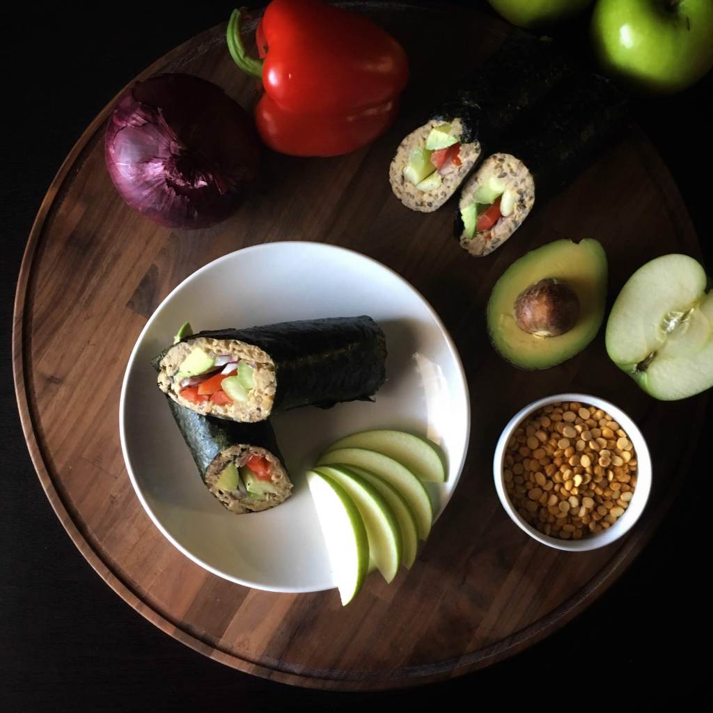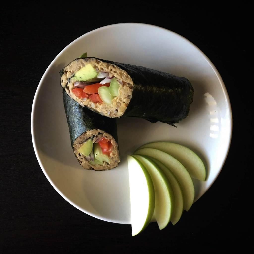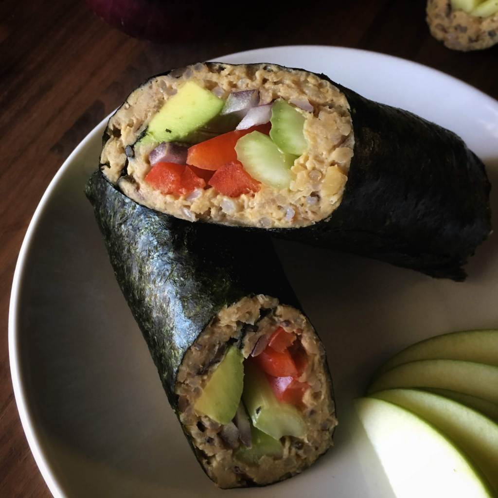 - Spread chickpea mixture over nori leaving 1 inch strip along top
