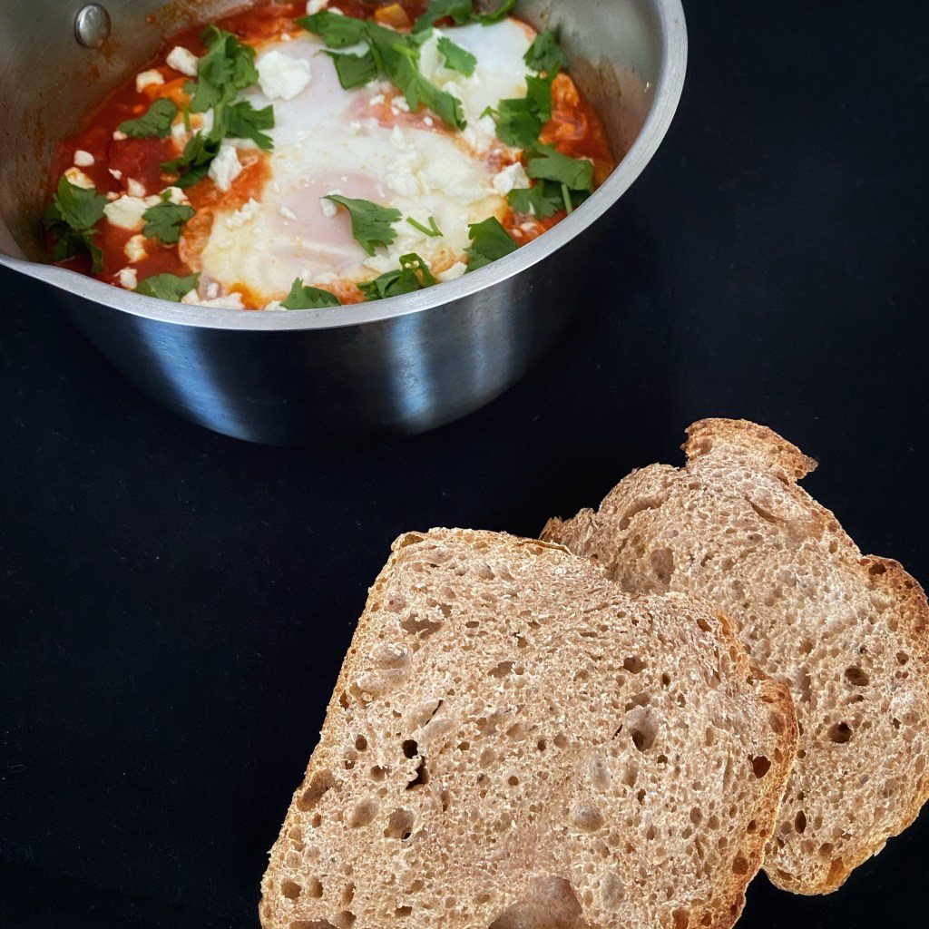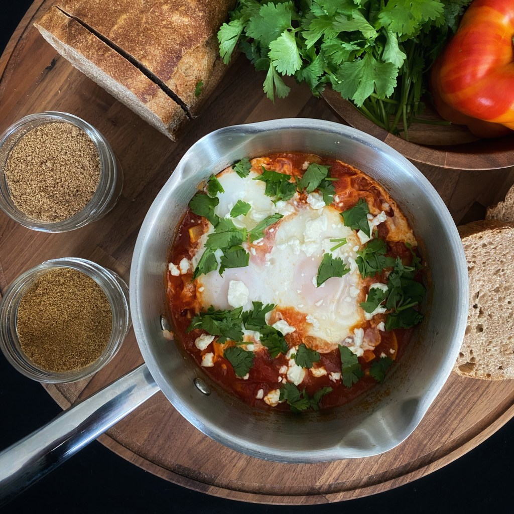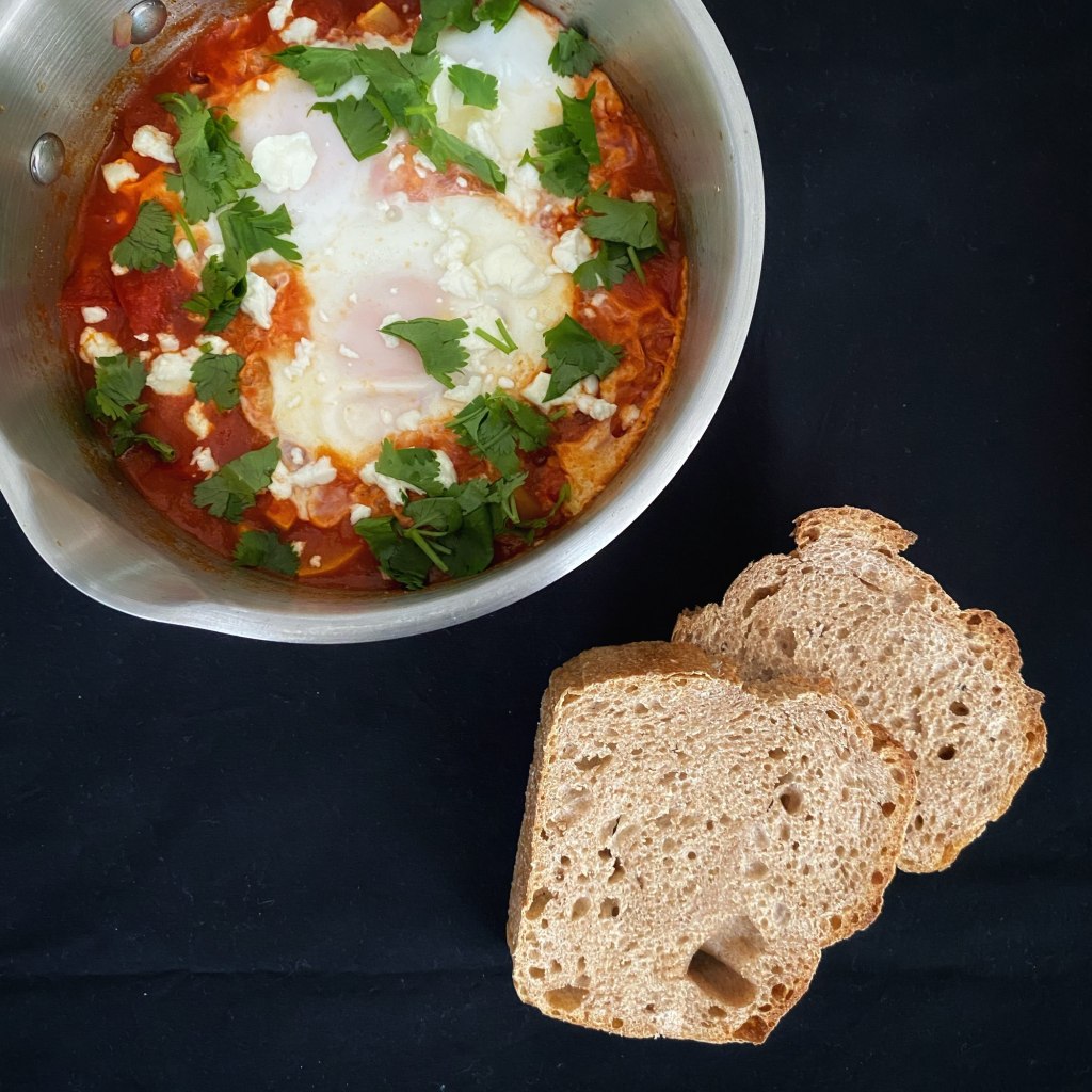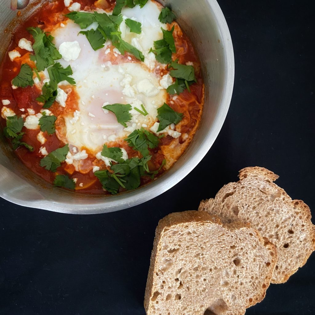 - Crack eggs on top of sauce and simmer with lid on until egg whites are cooked (5-10 minutes)