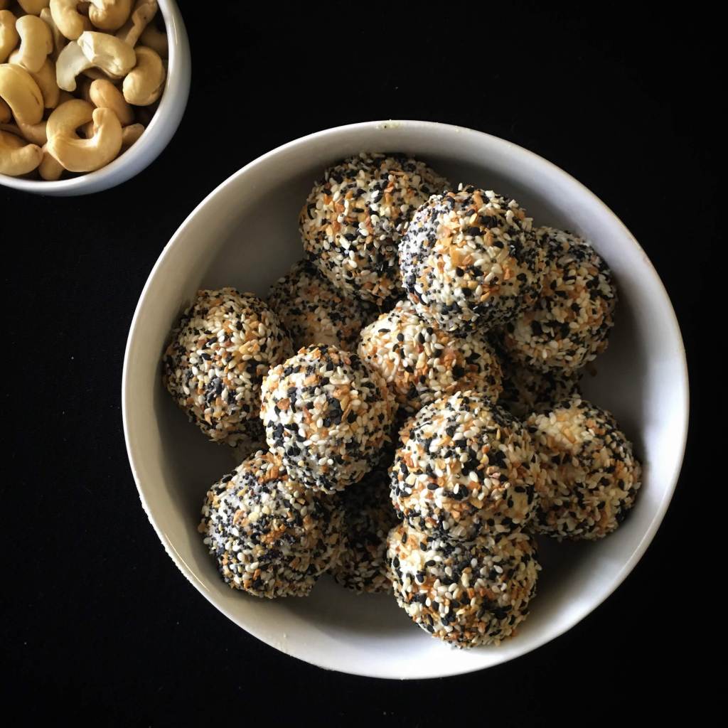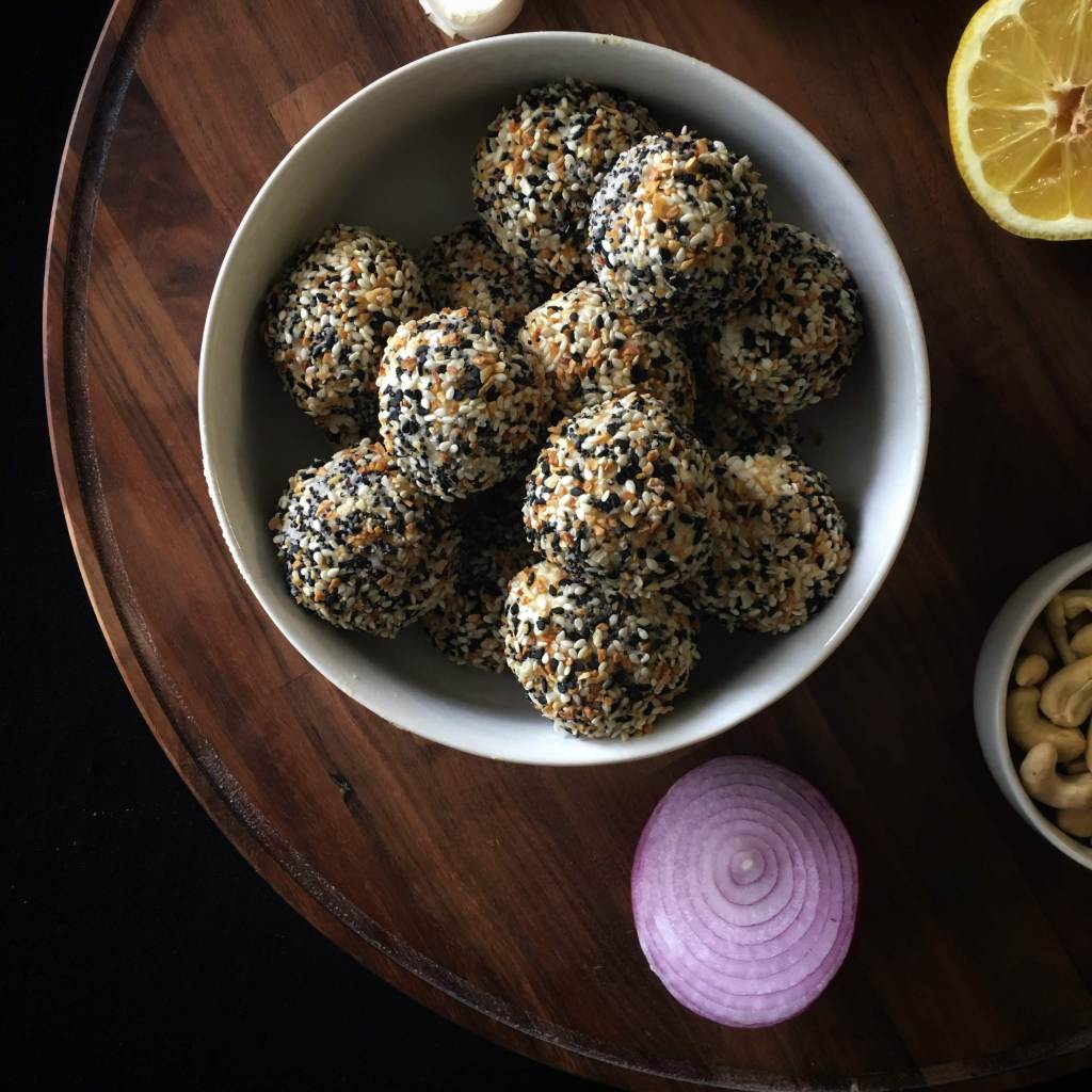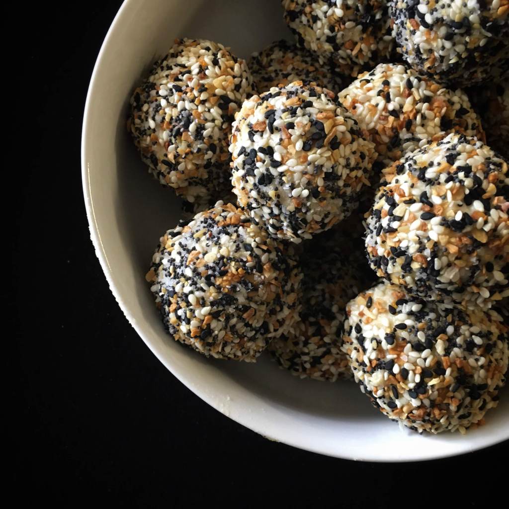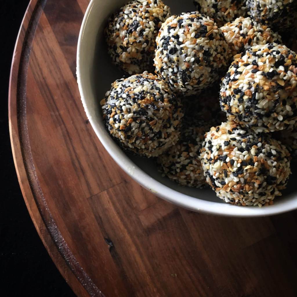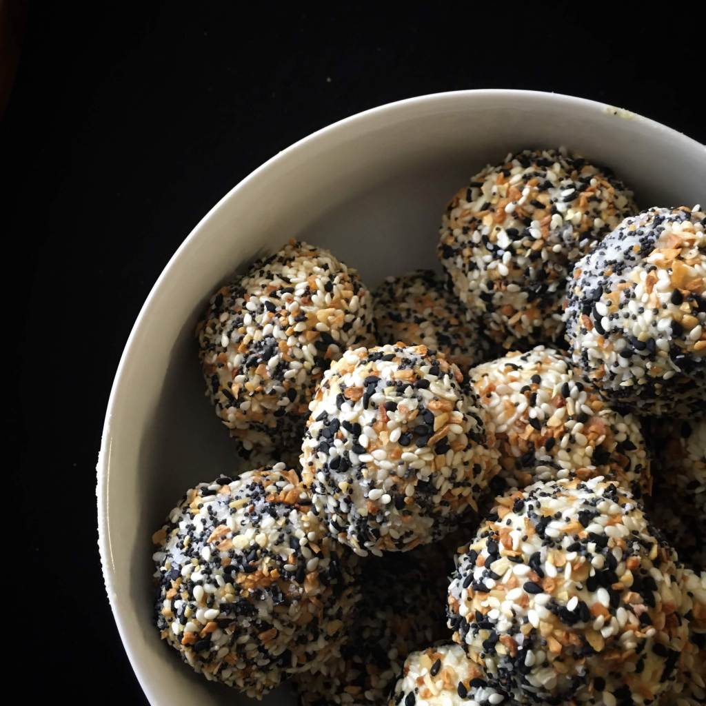 - Once mixture is dense enough to hold a shape, roll into small balls and cover in everything bagel seasoning