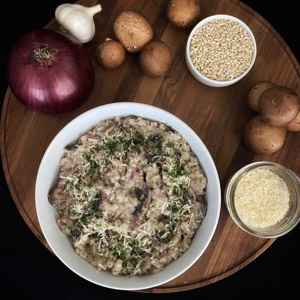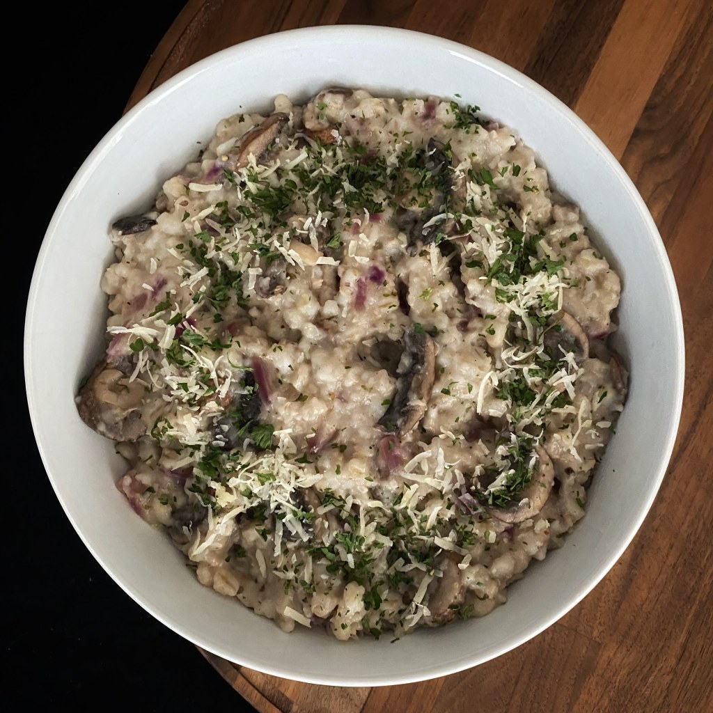 So. I made a mistake while cooking. I added way too much water to a batch of barley I was boiling in the pressure cooker. As a result, the barley came out a bit soupy. Though it would not work for my original intention, the barley became a perfect base for this mushroom risotto. Let me know what you think. I think it needs something crunchy.