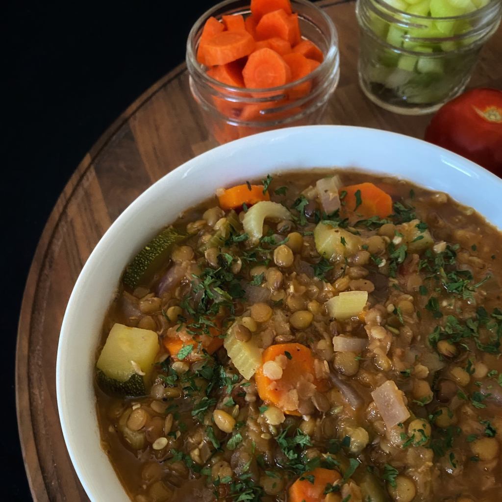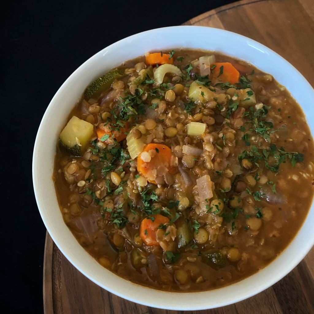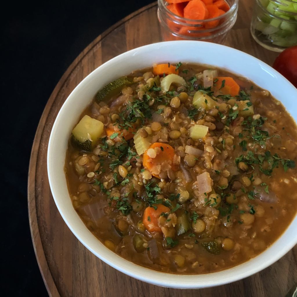 Sometimes, you need a sturdy soup with a lot of vegetables and some plant protein in the form of lentils.  They’re delicious so you’re welcome.  Also, this is a great recipe to use up the last of your marinara sauce.  This is a bit of a kitchen sink soup, so add whatever vegetables you have left in your fridge.