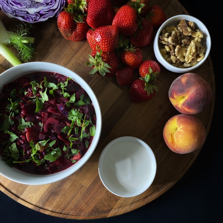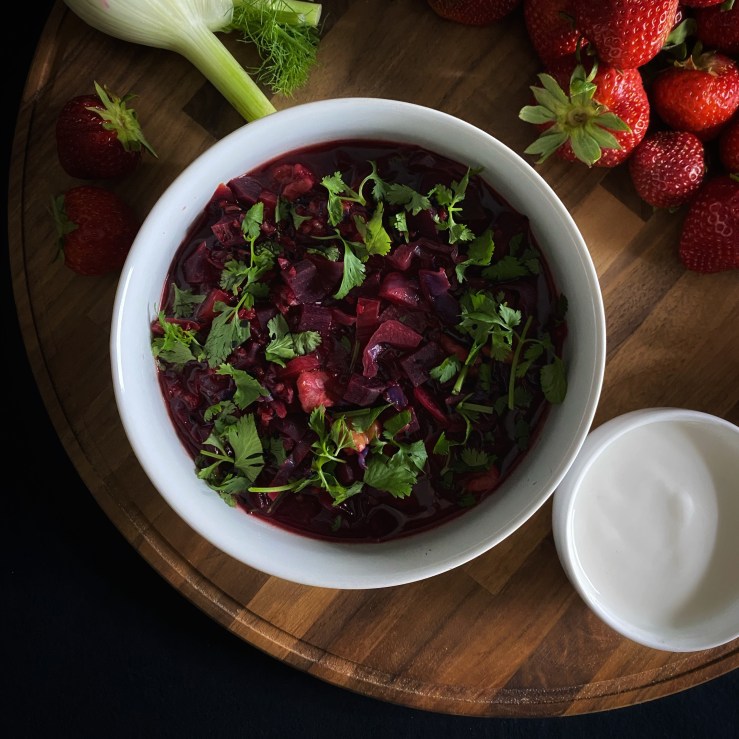 I have fallen in love with beets, and I will never look back. This soup has a bright, clear, red tinted broth that shimmers with drops of olive oil. The vegetables are hearty, and the wheat gives a nice texture and added nutrition. The humble ingredients together with the array of spices make this soup decadent and flavorful. I eat this soup at least twice a week, and I will continue to do so in perpetuity.