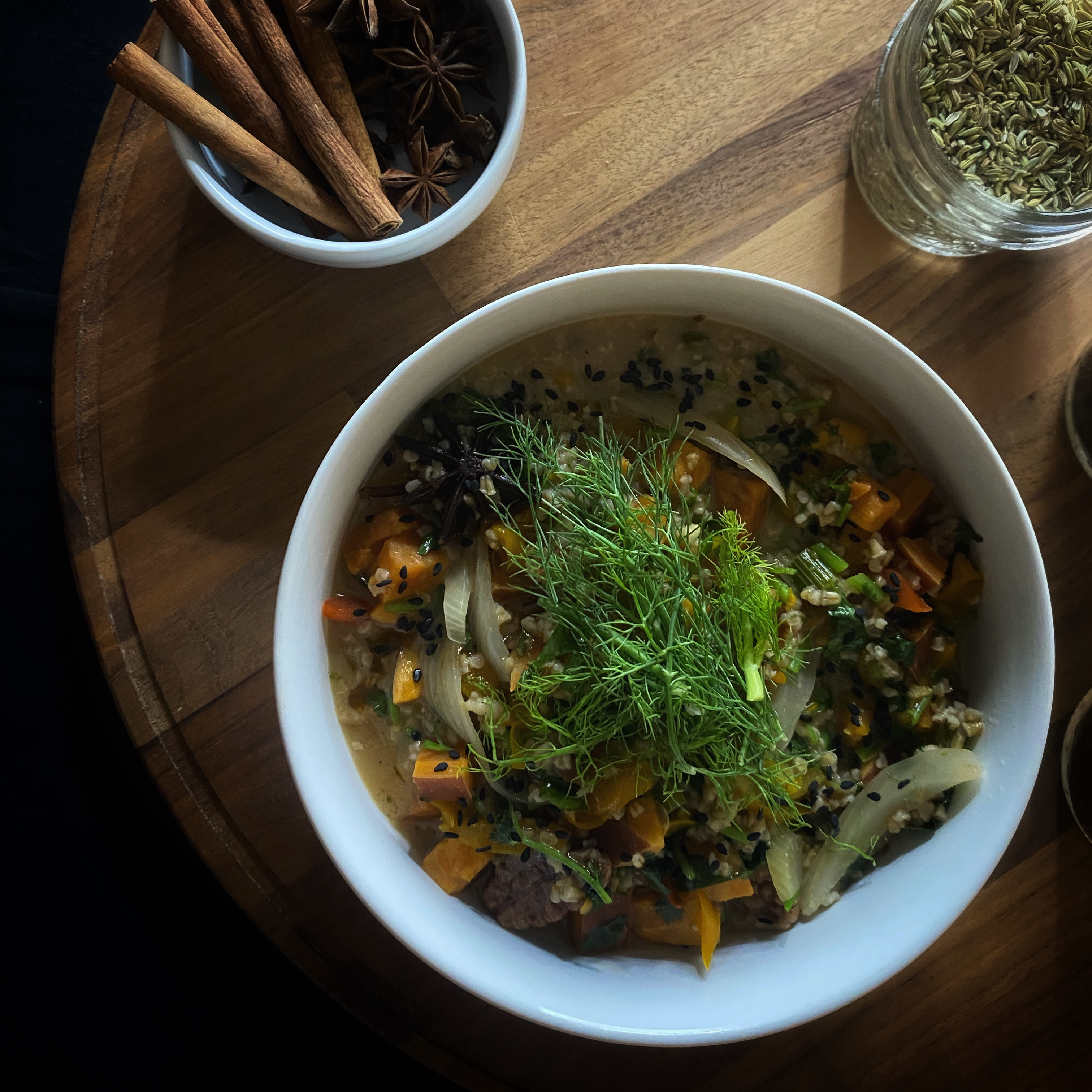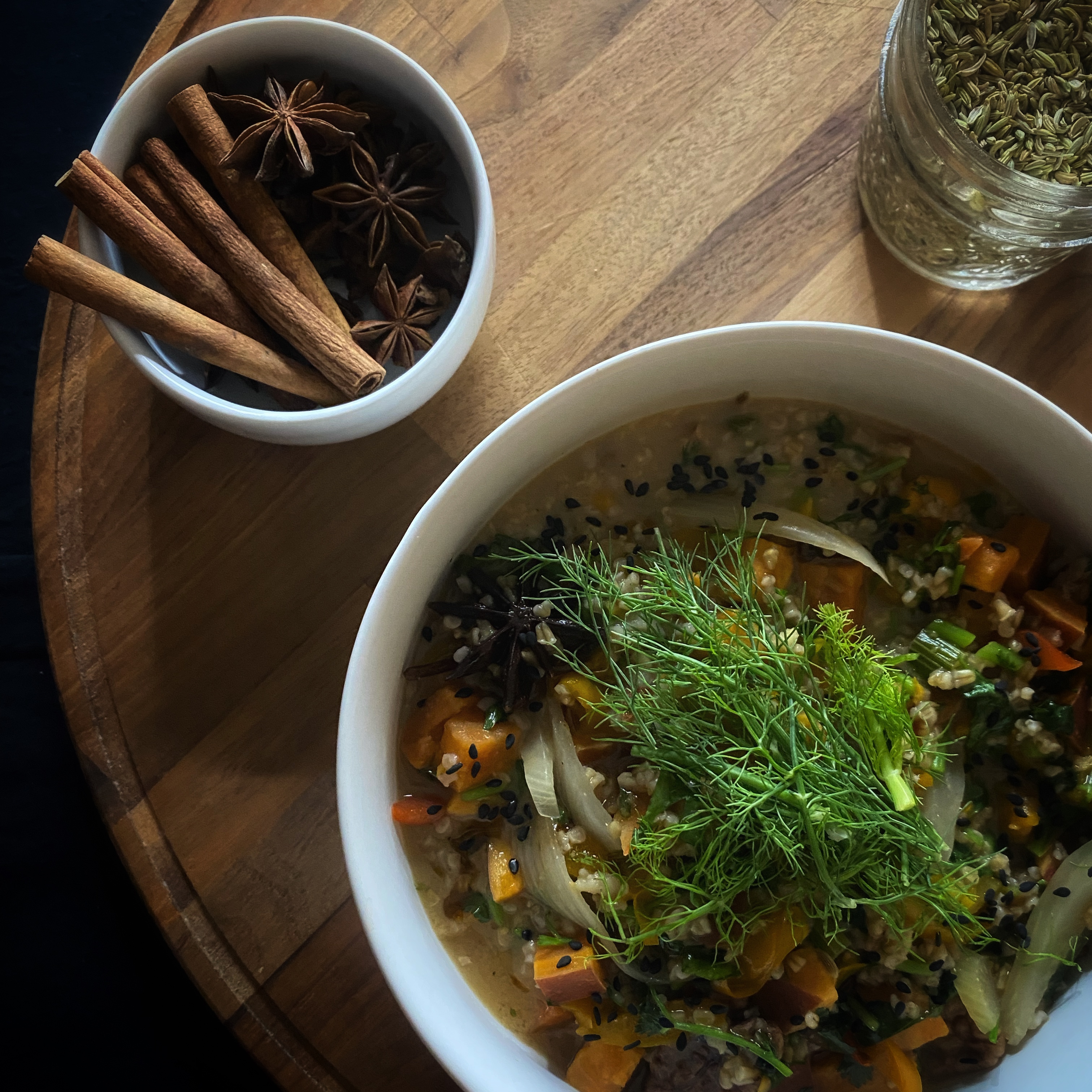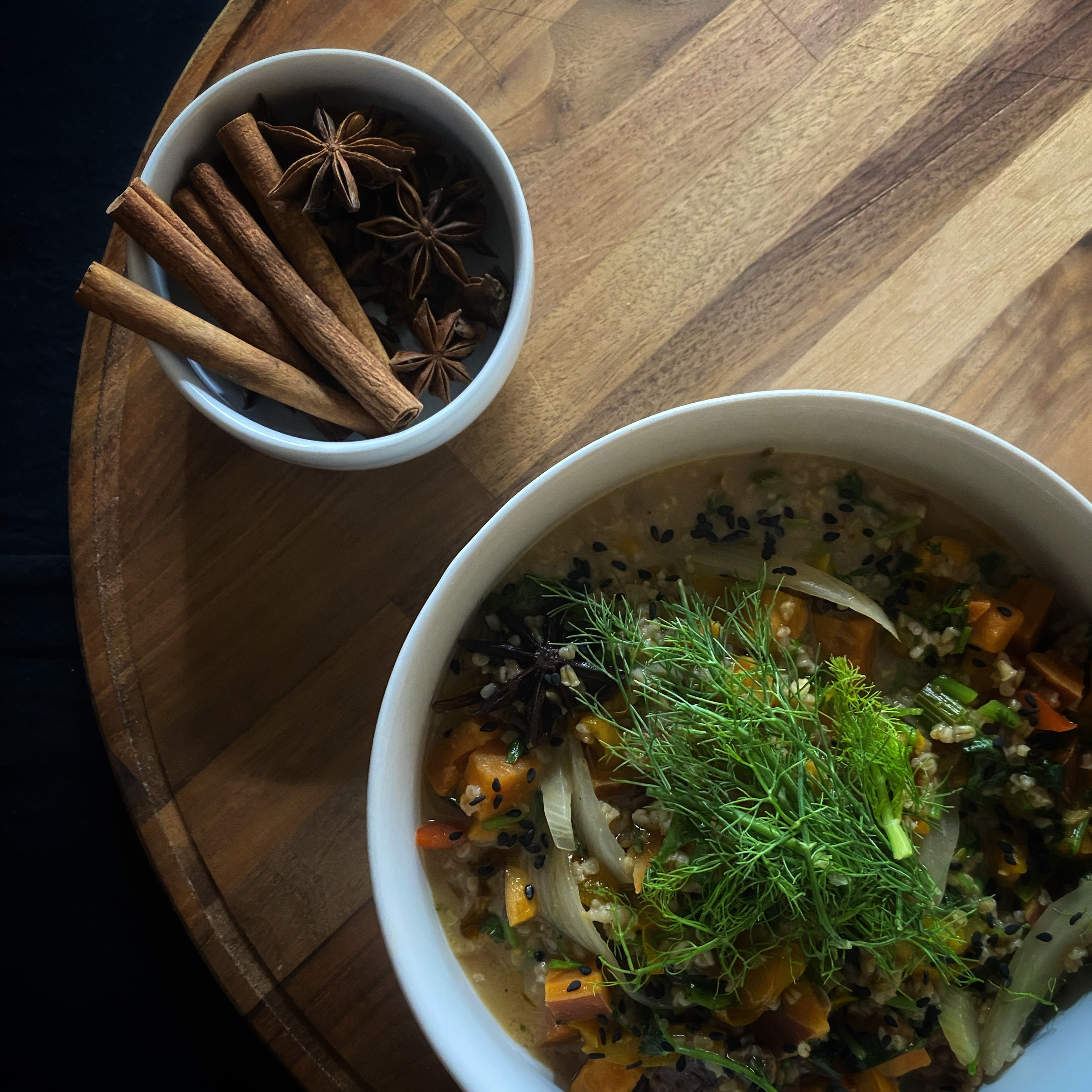 Alright y’all. Sweet oatmeal is out. Savory porridge is in. Without the oats, this is a lovely, aromatic, brothy soup. With the oats, it is a substantial meal that will keep you satisfied and light as you go through your day. I am not sure I will ever add fruit to my oatmeal again.