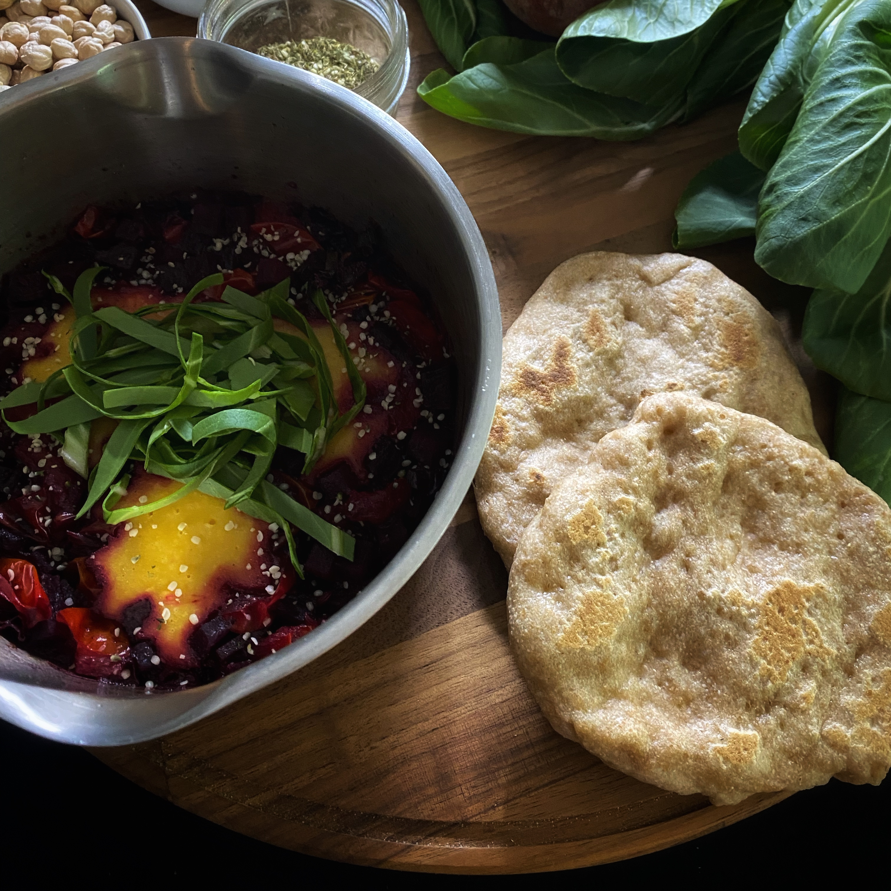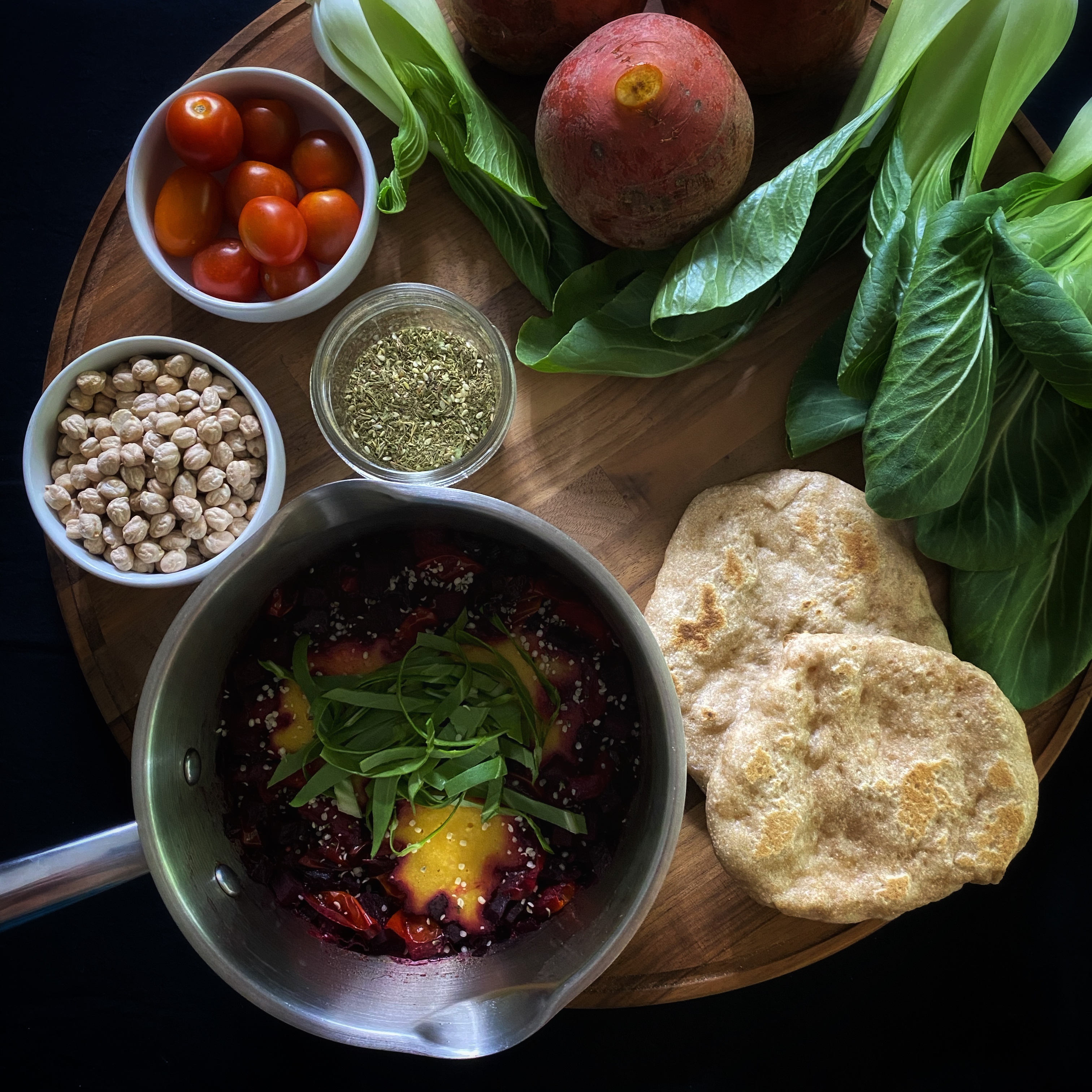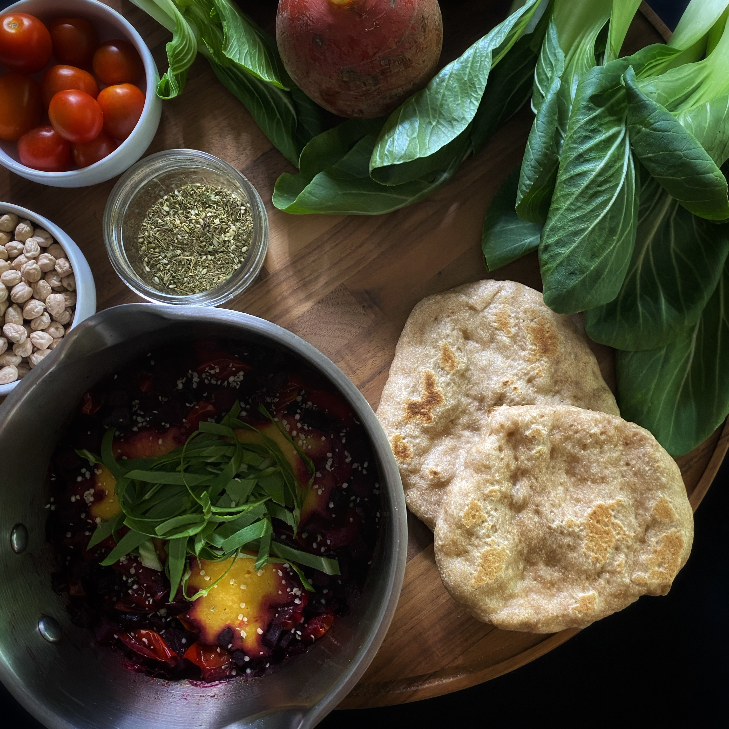 I must confess, I made this dish at the end of summer just as the leaves began to turn when the last tomatoes of the season were ripening on the vines. I would not recommend using tomatoes in this dish in the winter, but it is still delicious. I used besan flour (chickpea flour) as a dumpling that cooks in the beet and tomato sauce. The za’atar seasoning helped elevate this dish with bright, pungent herbs and the tangy hit of sumac. Serve this with any stovetop flatbread or grain of choice. This recipe serves 1.