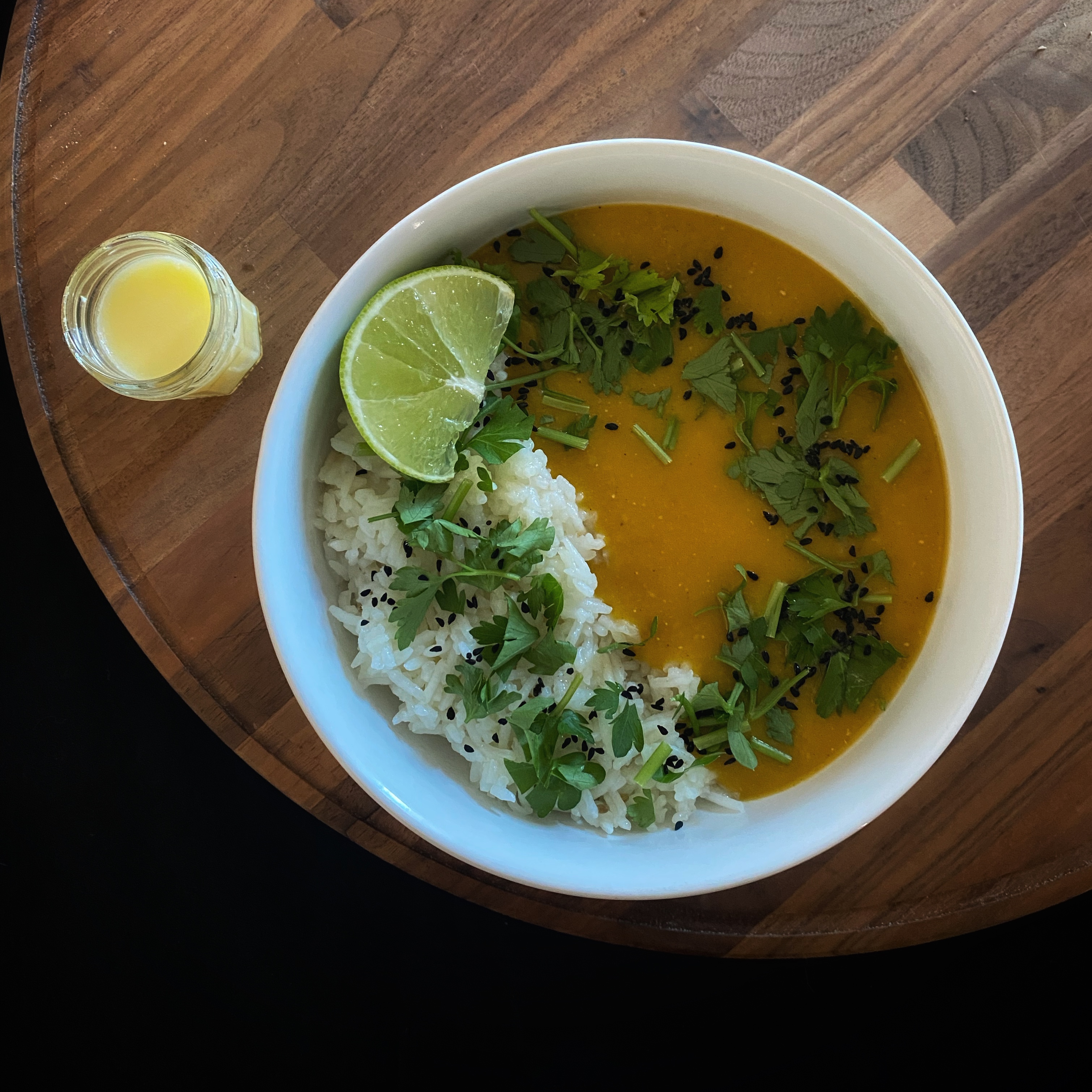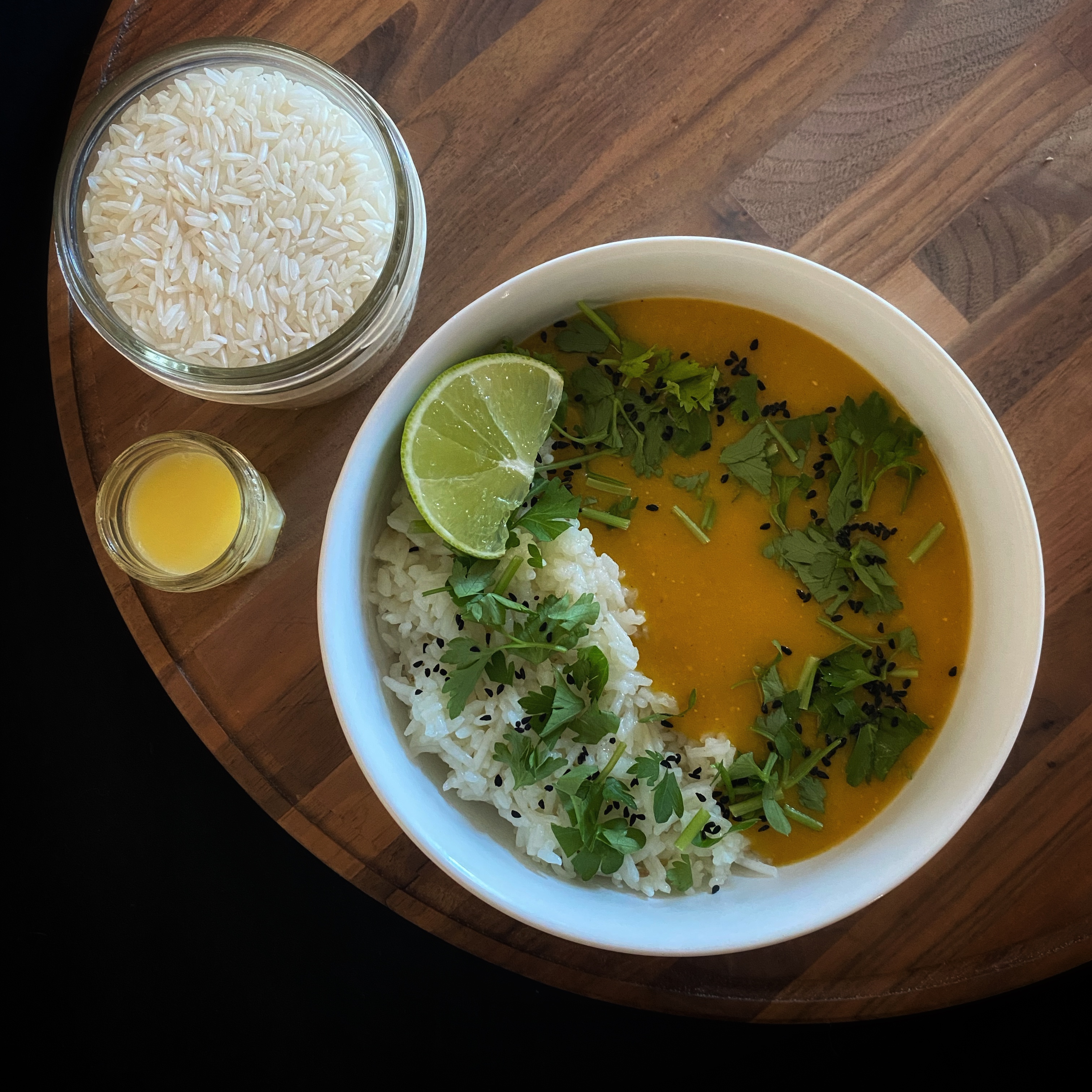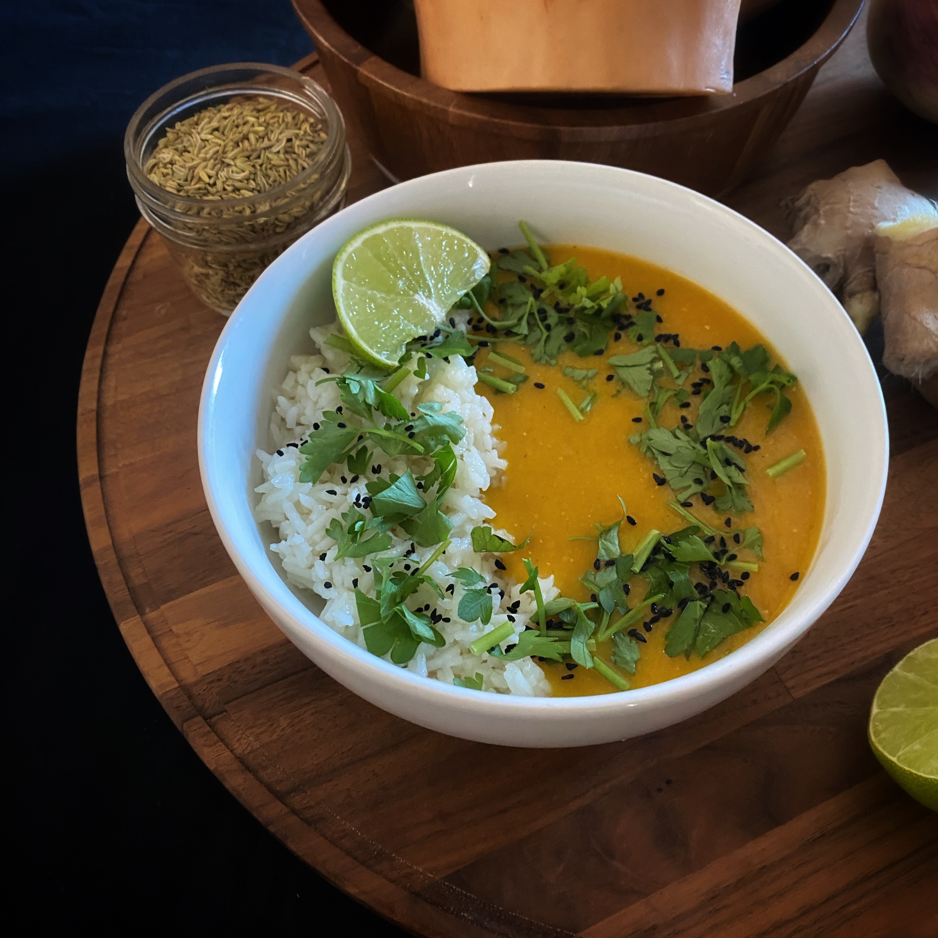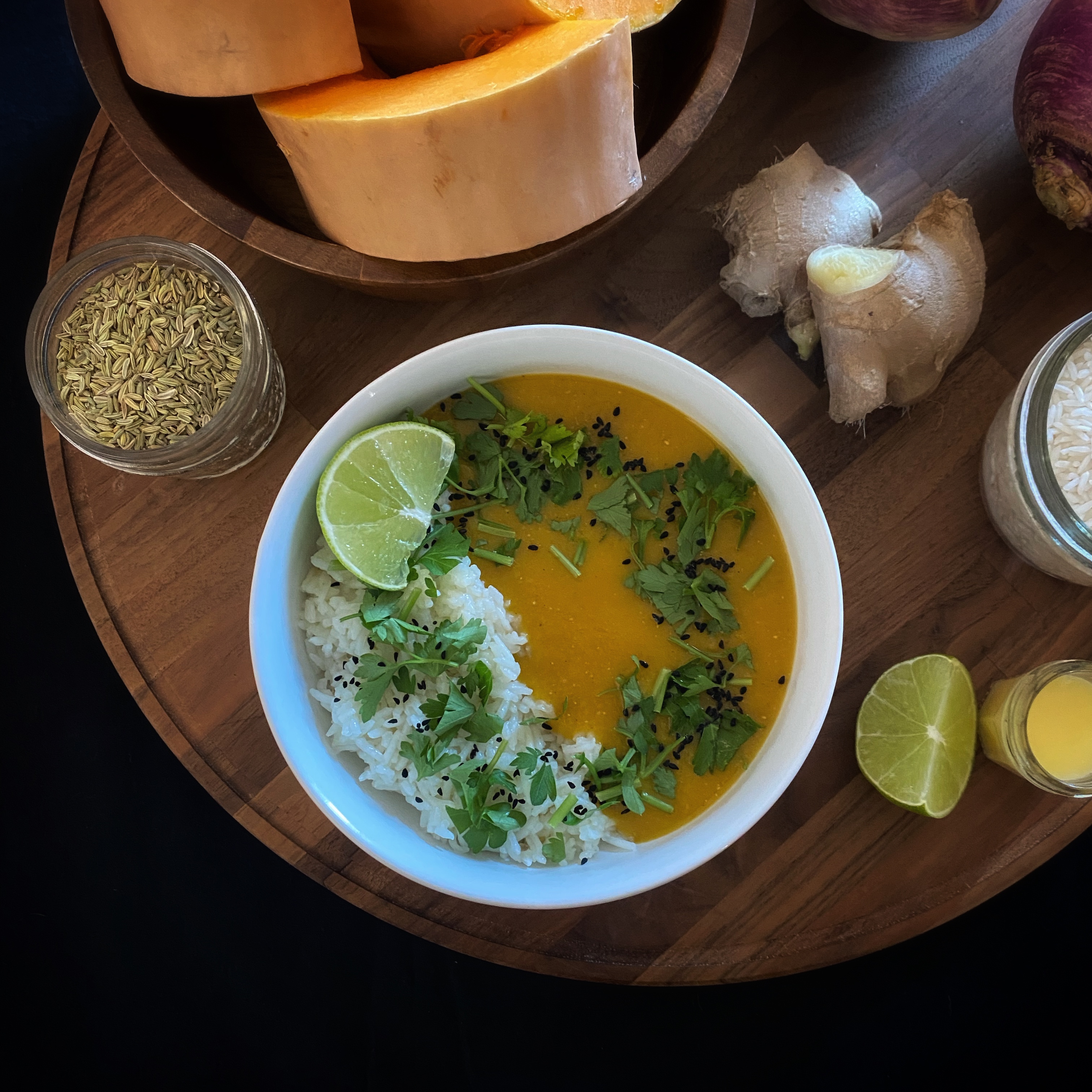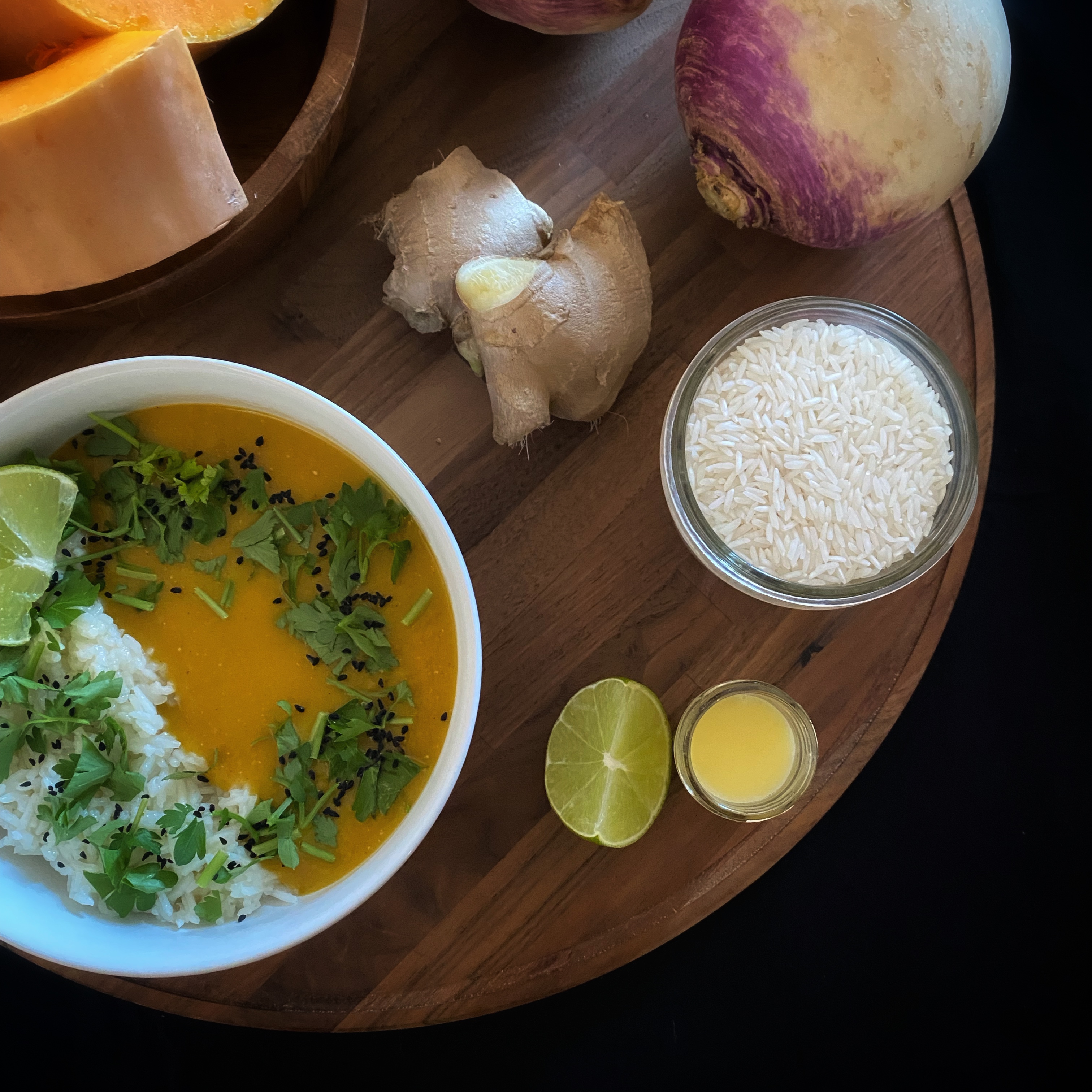 - In a pressure cooker, add the oil, spices, ginger, turnip, squash, and lentils
