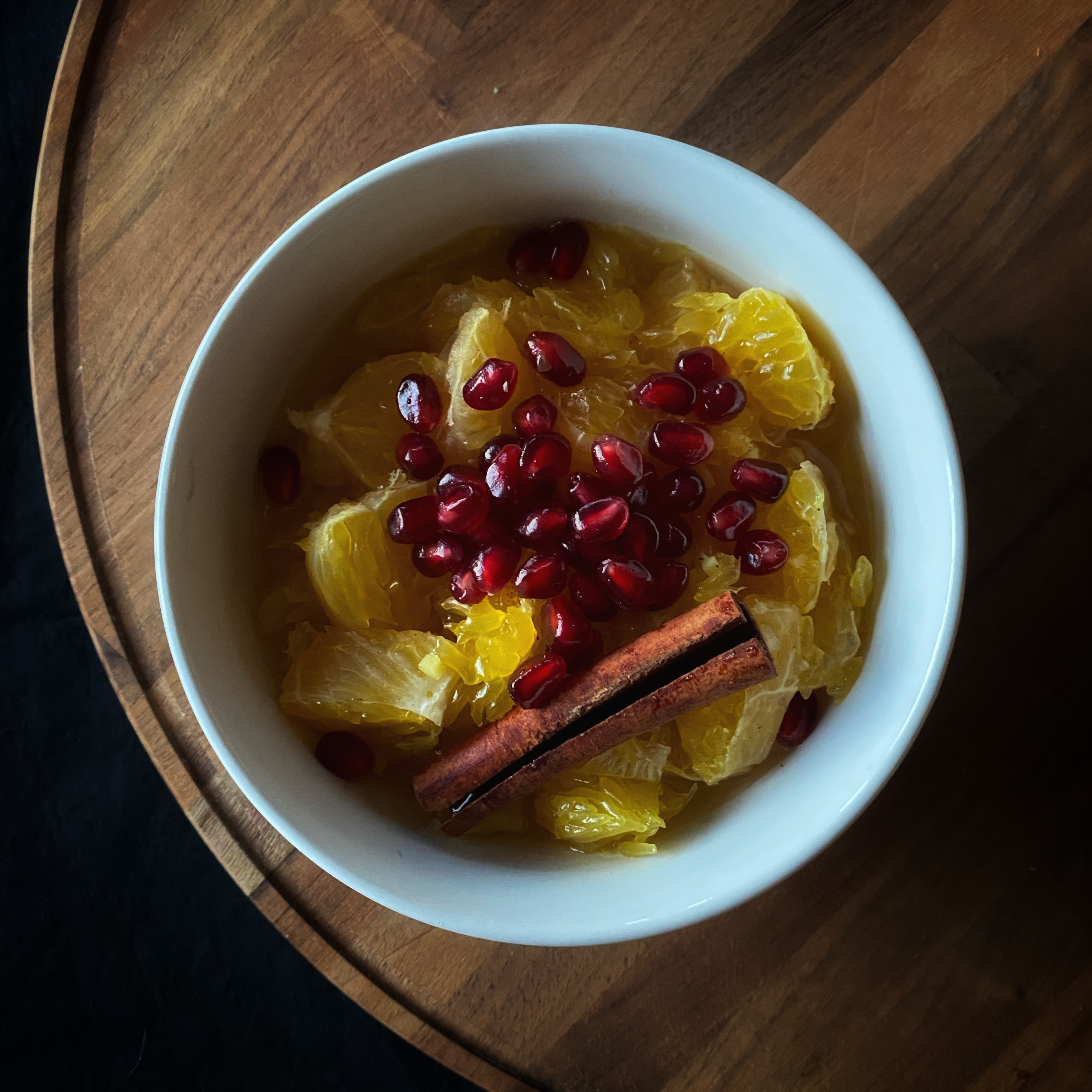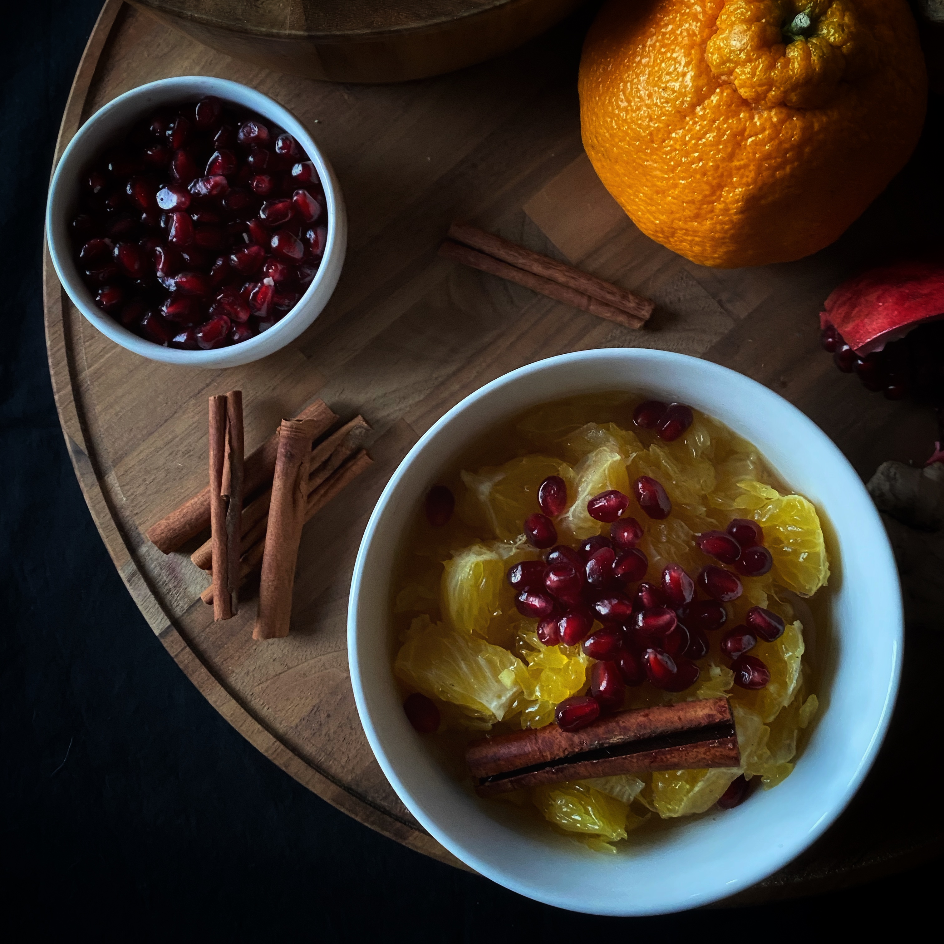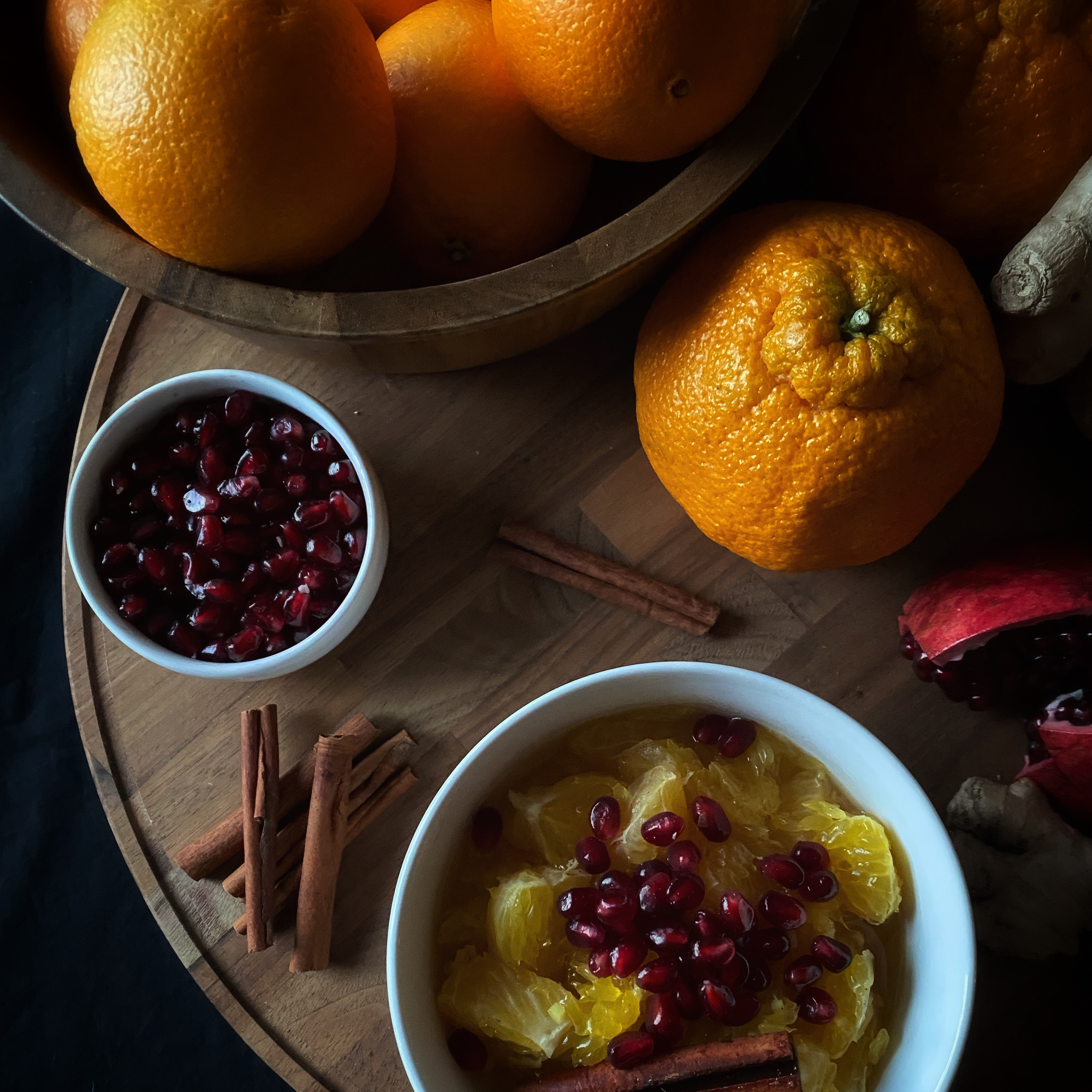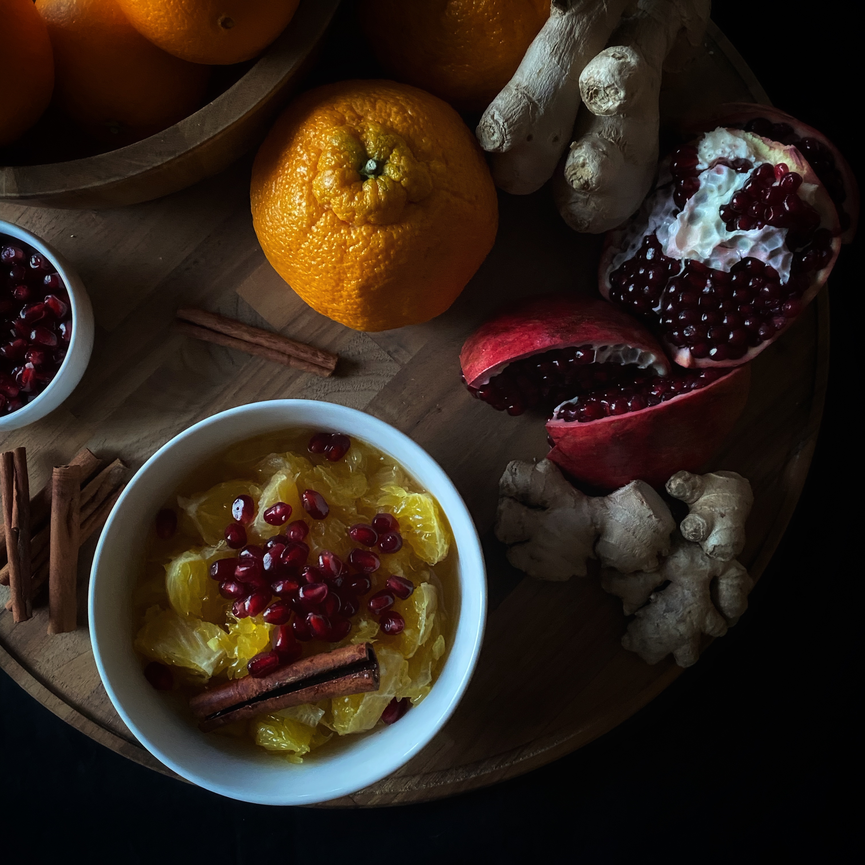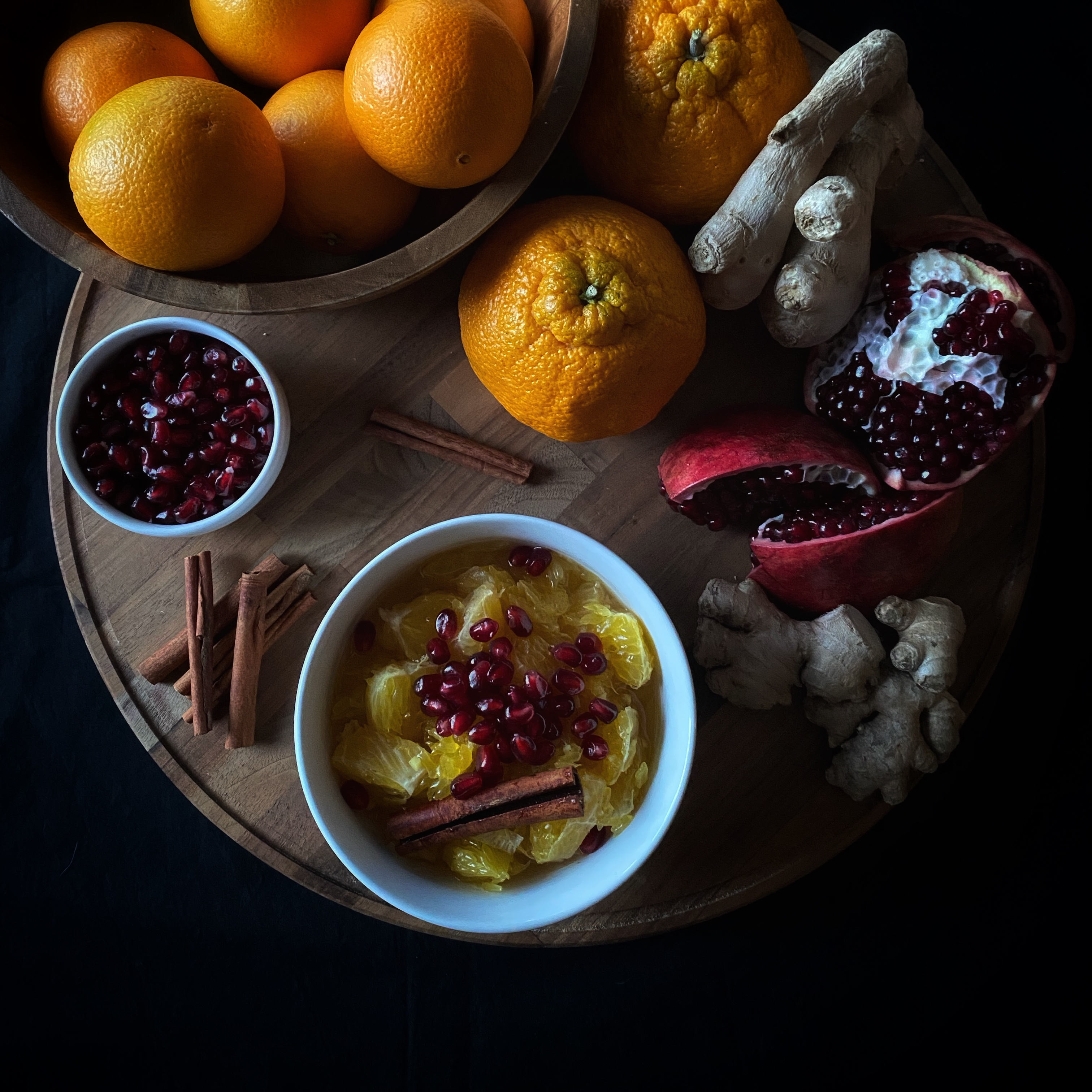 As I have explored more in the knowledge of Ayurveda, I have enjoyed beginning my day with a common recipe to gently begin the daily digestion process: stewed fruit, which I affectionately call fruit soup. I thought of this recipe when I was away from home spending time with family for the holidays, and I bought a bag of oranges that I did not know what to do with. The combination with ginger and cinnamon, topped with pomegranate seeds is bursting with freshness and pungent flavors that will warm you from the inside out this winter. This recipe serves one.